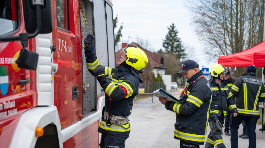 6. April 2026Heute fand in Thalheim die Abnahme der Branddienstleistungsprüfung statt. Die Feuerwehrmitglieder traten in den Stufen Bronze, Silber und Gold an. Dabei mussten die Gruppen jeweils eines von drei vorgegebenen Szenarien bewältigen: Heckenbrand, Zimmerbrand oder Flüssigkeitsbrand.