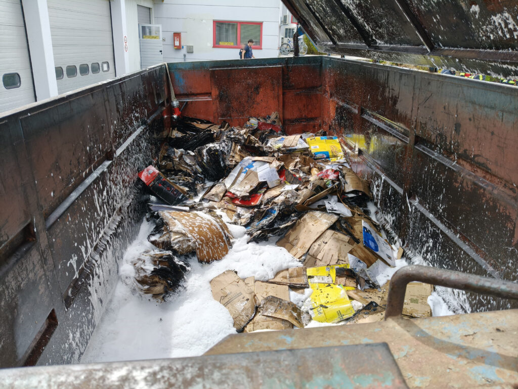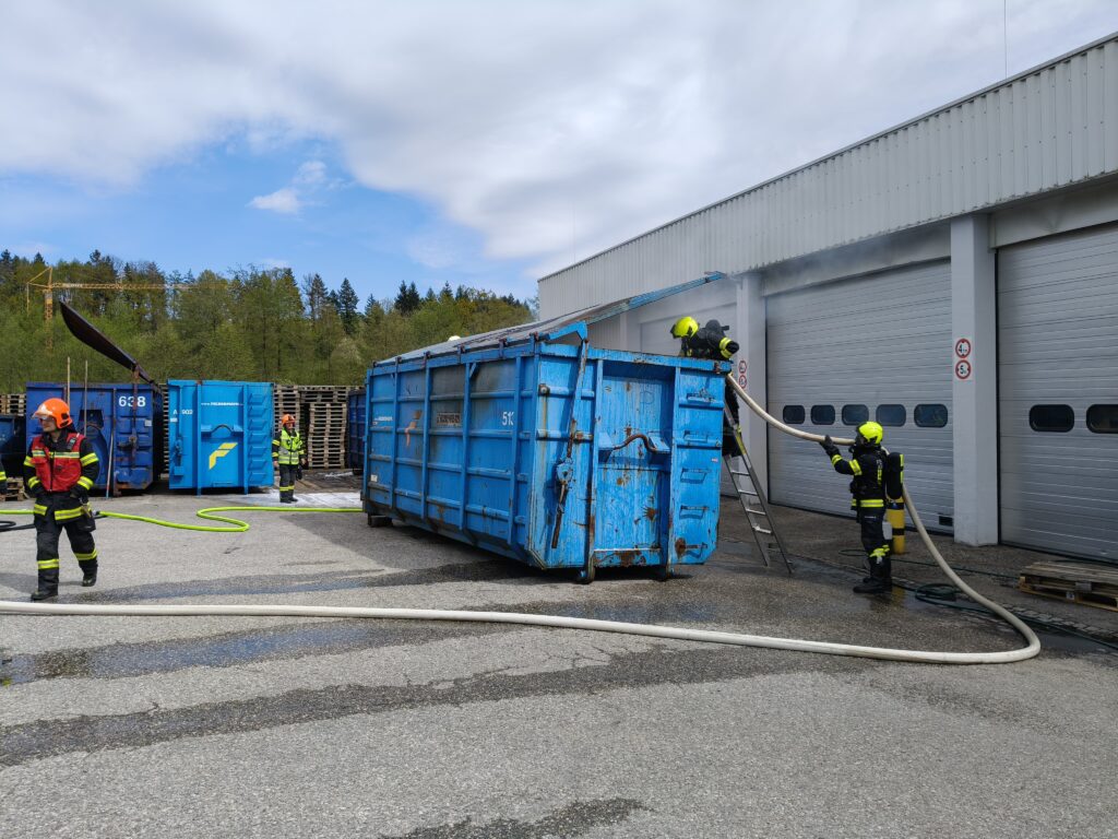 Eine Löschleitung wurde aufgebaut und ein Atemschutztrupp nahm die Brandbekämpfung vor. Anschließend wurde der Container mit Schaum abgedeckt, um eine Wiederentzündung zu verhindern.