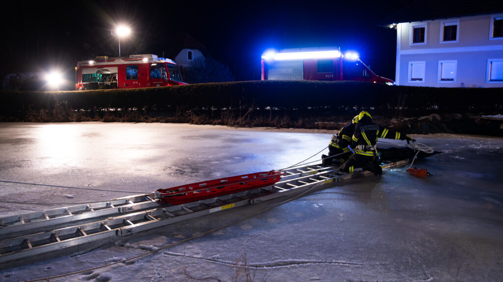 Zügig wurden Leitern und weitere Rettungsmittel zum Teichufer gebracht. Anschließend platzierten wir die Leitern auf dem Eis, um zu der verunglückten Person zu gelangen. Zwei Feuerwehrmänner, gesichert mit Rettungsleinen, bestiegen die Leitern und nahmen Kontakt zur Person auf. Die restlichen Feuerwehrleute bereiteten eine Korbtrage vor, die dann mittels Arbeitsleine vom Rettungstrupp zur Einbruchstelle gezogen wurde. So konnte die Person sicher aus dem Wasser gerettet werden.