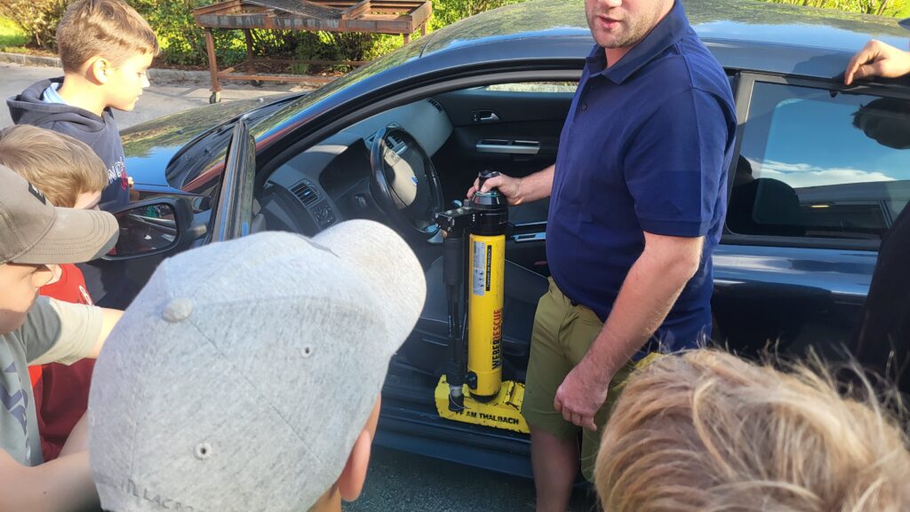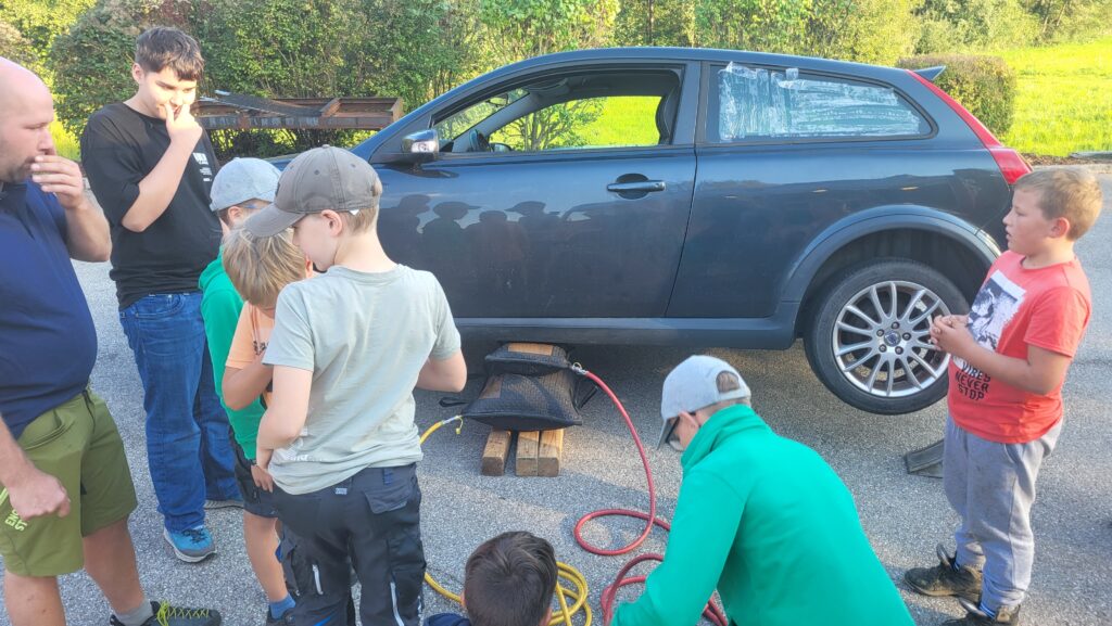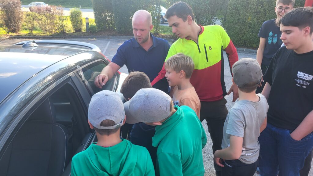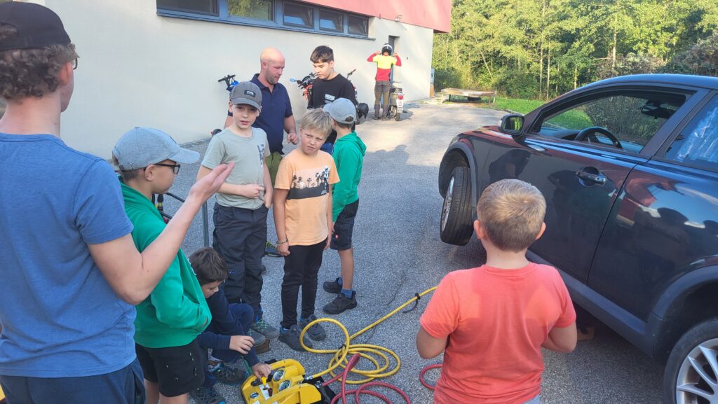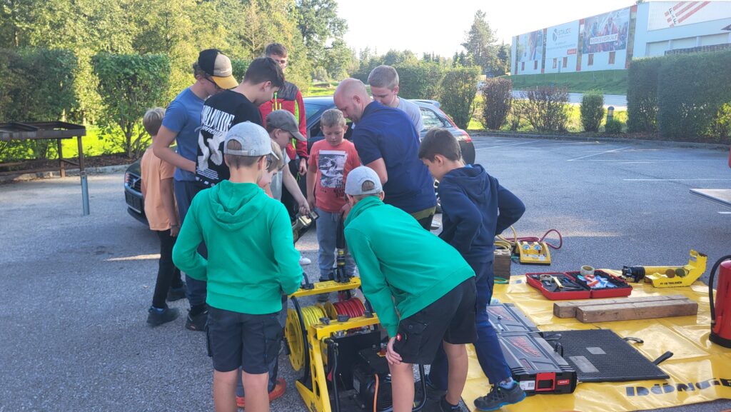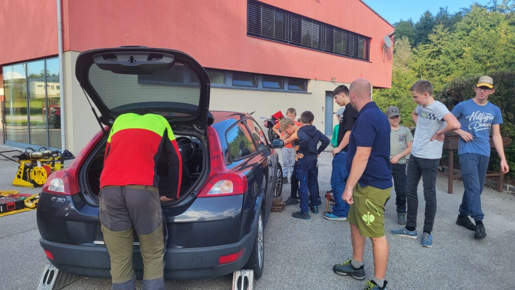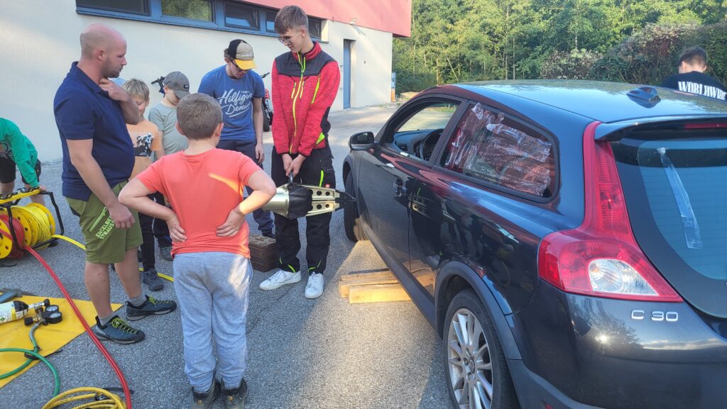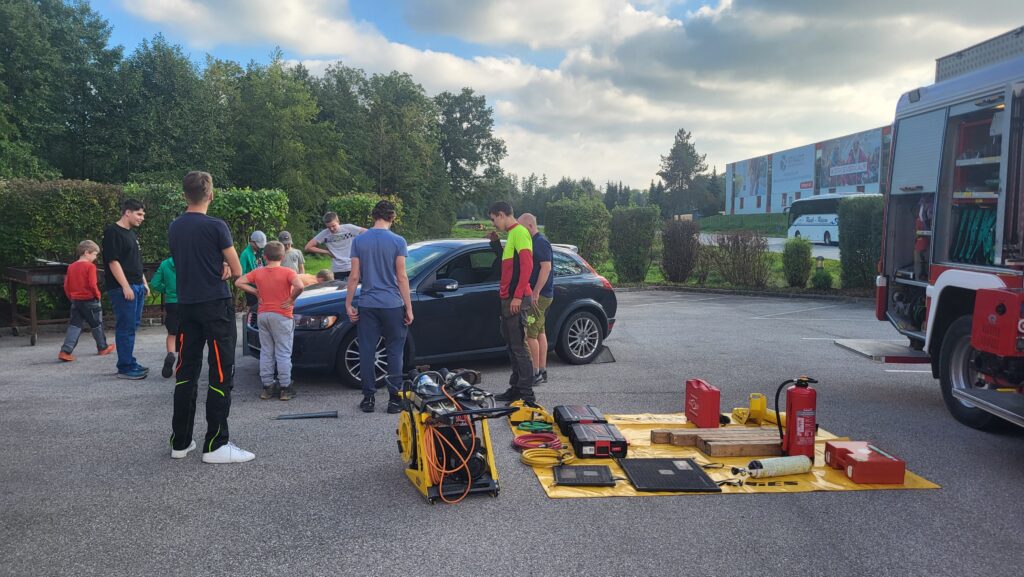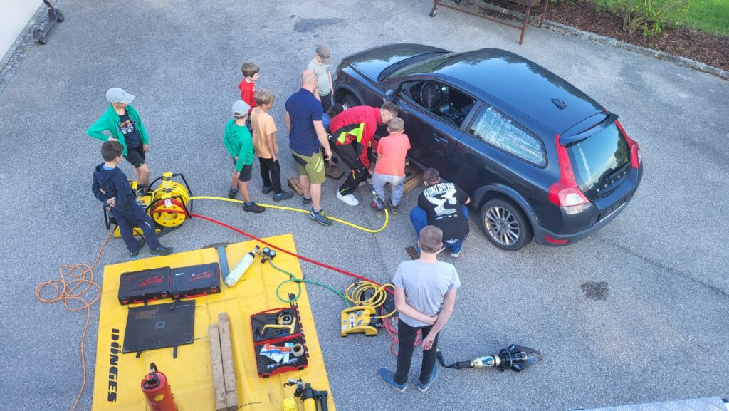 Dabei lernten die jungen Florianis die Erstmaßnahmen wie das Absichern eines verunfallten Fahrzeugs, sowie alle Geräte für den technischen Einsatz, diese wurden zunächst auf die Bereitstellungsplane aufgelegt, erklärt und teilweise angewendet.
